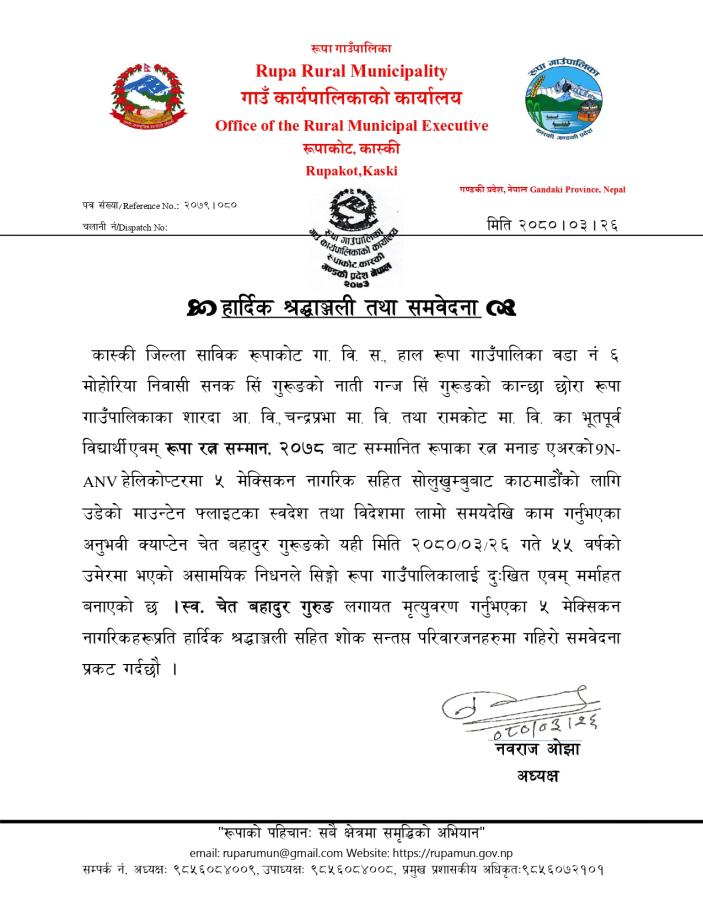 Home » हार्दिक श्रद्धाञ्जली तथा समवेदना स्व. चेत बहादुर गुरुङ लगायत मृत्युवरण गर्नुभएका ५ मेक्सिकन नागरिकहरूप्रति हार्दिक श्रद्धाञ्जली सहित शोक सन्तप्त परिवारजनहरुमा गहिरो समवेदना प्रकट गर्दछौ ।