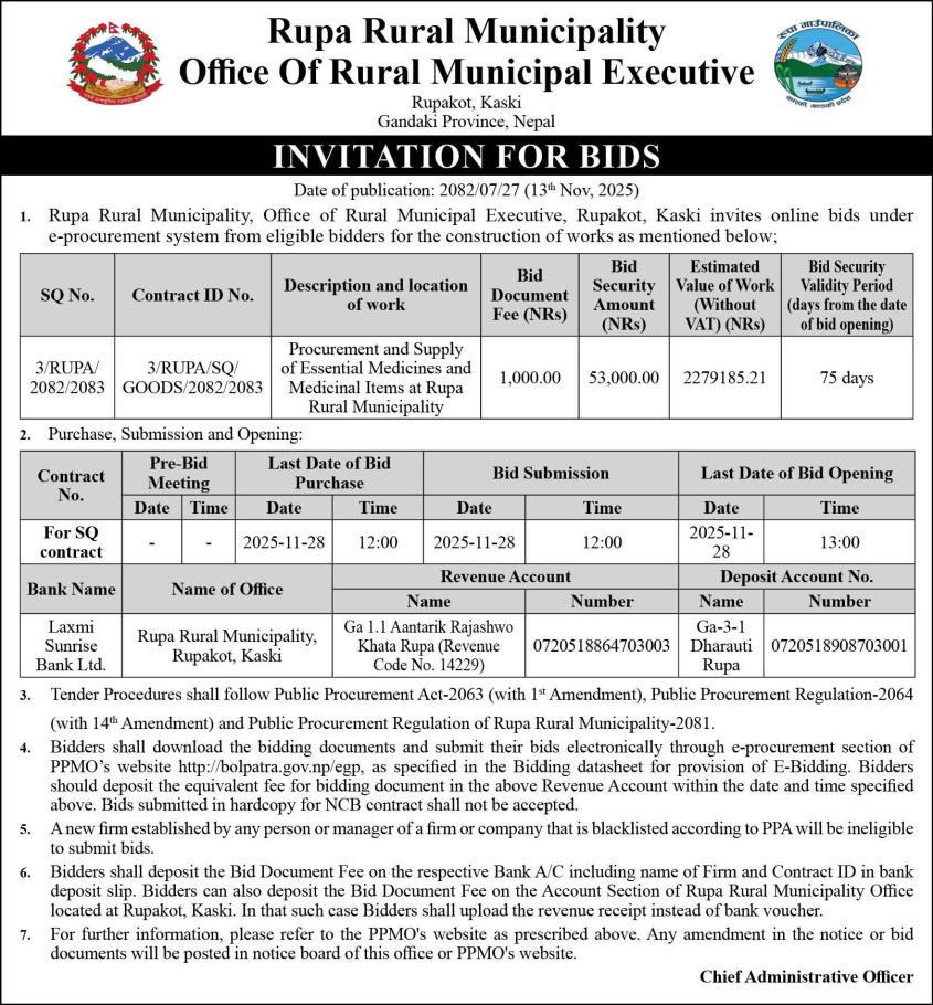 » Procurement and Supply of Essential Medicines and Medicinal Items at Rupa Rural Municipality